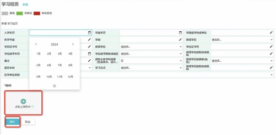 5、 以学习经历为例,点击新增按钮,展开学习经历新增页面,完整填写信息后点击“暂存”。部分信息只开放给教职工查看,例如“考核结果”信息。目前授权为只能查看。
