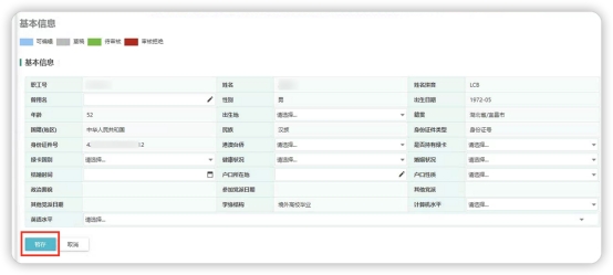 3、 在教职工基本信息变更管理模块中,可以修改个人基本信息和经历信息(根据学校规划,目前部分信息开放给教职工进行维护,修改后信息需要经过审核后生效)。点击基本信息中的“编辑”按钮,进行维护,修改后分别点击暂存。