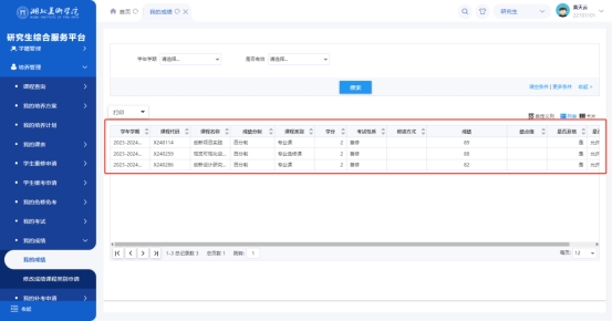 2. 列表显示该学生已获得的课程成绩信息。
