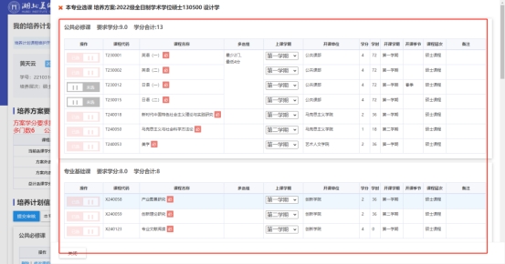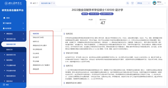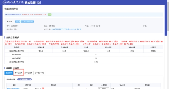 2. 界面显示该学生对应的培养方案,左边列表切换后,显示培养方案详细信息。