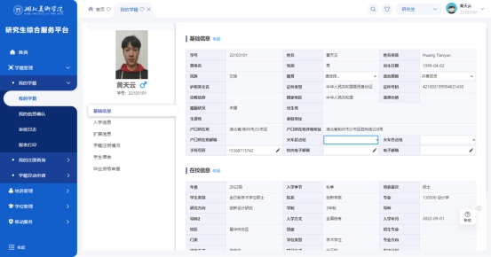 2. 页面显示学生个人详细信息,学生可以对已开放的字段进行完善。